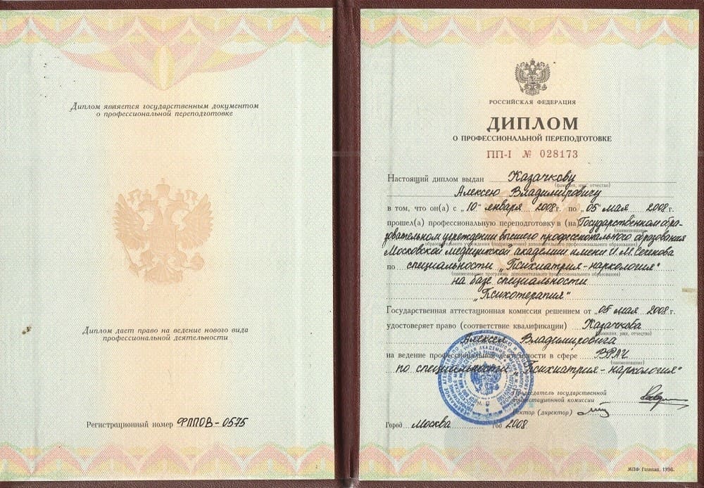 • 1998 – Первый Московский медицинский университет им. Сеченова (Ординатура по специальности «Психиатрия»).
